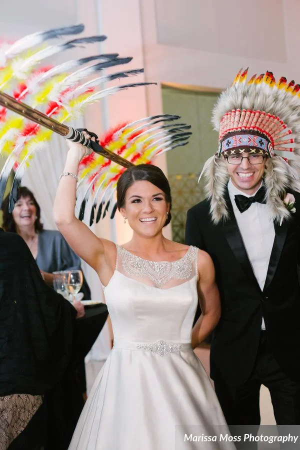 The FSU-loving bride and groom sported Seminole headdress and spear for their introduction